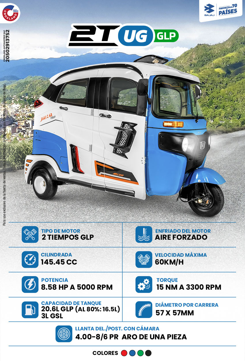 Si eres nuevo en el mundo de los motocarros, el 2T UG es tu mototaxi, con un bajo costo de mantenimiento y gran rendimiento, podrás recuperar tu inversión en poco tiempo. Así mismo, con la versión GLP ahorrarás aún más. Además, cuenta con el Sistema Autolube patentado por Bajaj, lo que permite realizar un óptimo uso del aceite para que las partes de tu vehículo estén siempre lubricadas.